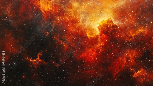 Fototapeta premium Abstract red and orange cosmic nebula with intense starbursts shining...