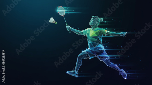 Fototapeta premium Abstract representation of a badminton player in action, visualized using a low polygon design with neon lights, symbolizing precision, agility, and digital dynamism in sports imagery