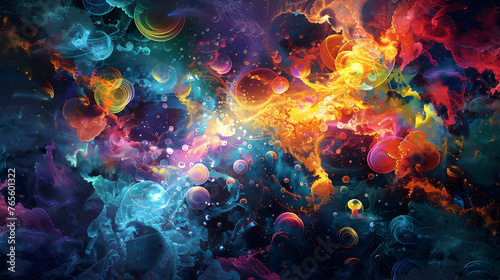 Fototapeta premium Abstract representation of a chemical reaction, where brightly colored molecules collide and merge in a dance of transformation.