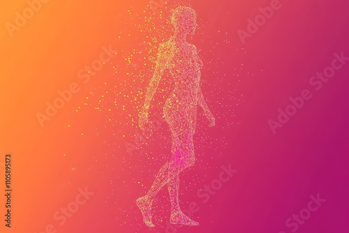 Fototapeta premium Abstract Representation of a Walking Human Figure in Colorful Particles and Wireframe Design Against a Vibrant Gradient Background for Creative Concepts