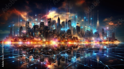 Obraz premium Abstract representation of digital business networks connecting through a virtual cityscape