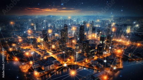 Obraz premium Abstract representation of digital business networks connecting through a virtual cityscape