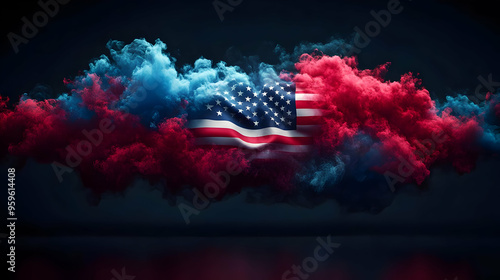 © Siasart Stock, Obraz premium Abstract representation of the American flag amidst colorful clouds.