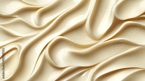 © Matcha_09, Obraz premium Abstract ripples of molten white chocolate on a seamless, clean white surface, top view.