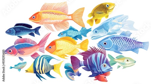 Fototapeta premium Abstract school of fish of different colors and sizes on white background, which can be used as graphic resources together and separately