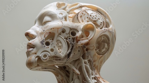 © Karaket, Fototapeta premium abstract sculpture of a head and neck in profile with the skin made of complex patterns incorporating gears and mechanical elements