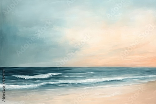 © Umar, Obraz premium Abstract Seascape Painting with Blue and Peach Tones