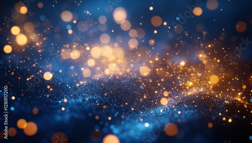 Fototapeta premium Abstract shimmering background with bokeh effect, glowing dots, and mystical sparkles in vibrant blue and orange hues for creative design projects