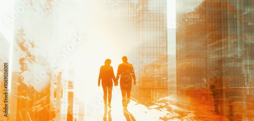© evening_tao, Obraz premium Abstract Silhouette of Couple Walking in Cityscape
