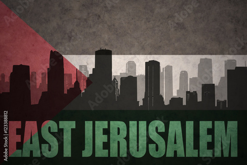 Fototapeta premium abstract silhouette of the city with text East Jerusalem at the vintage palestinian flag background