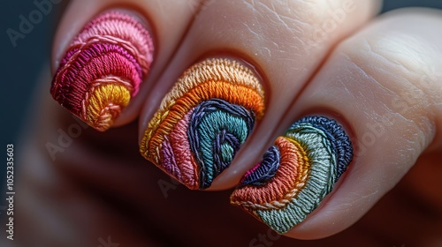 Naklejka premium Abstract silk embroidery nail art, featuring freeform thread patterns in vibrant colors, creating a textured and layered effect, with a matte neutral background for contrast, hd quality, macro shot,