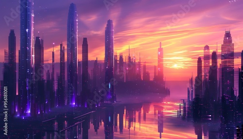 Fototapeta premium Abstract skyscrapers in the city at sunset