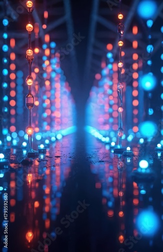 © miss irine, Fototapeta premium Abstract space with blue orange lights tunnel. Glowing dots hang in air. Night backdrop with bright illuminations. Sci-fi scene reflects on wet ground. Futuristic concept for design tech projects.