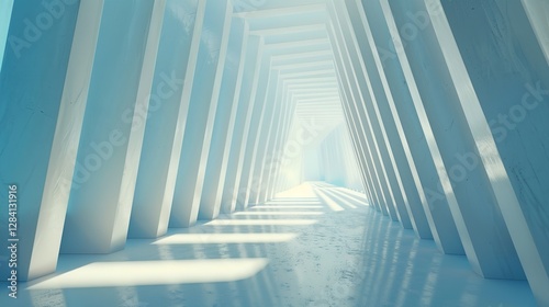 © zishan, Naklejka premium abstract. spacecraft interior with a futuristic design on a blue backdrop. Abstract 3D interior design of a corridor using linear lighting. 3D visualisation, Generative AI.