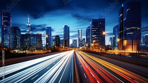Fototapeta premium Abstract speeding or fast Motion blur of a highway overpass road, Long exposure to a speedy night drive in a big city skyline at night.