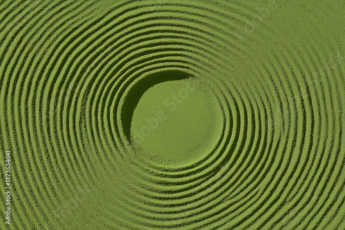 © Artificial South, Obraz premium Abstract Spherical Ripples: A captivating visual of concentric circular patterns radiates from a central sphere, embodying the delicate interplay of energy and form in a textured green setting.