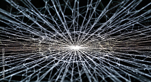 © Husnayaini, Obraz premium Abstract spider web–like network of radial light lines converging toward a bright central point on a dark background symbolizing data connection, energy flow, technology network