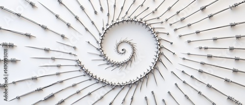 © Bassmallah, Obraz premium Abstract spiral of metallic pins on white background.