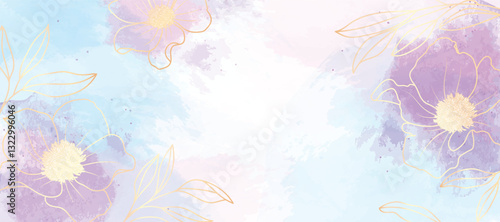Fototapeta premium Abstract spring floral art background vector illustration. Watercolor botanical flower and gold brush line art texture. Luxury design for wallpaper, poster, banner, card, print, wedding.