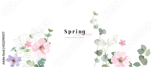 Fototapeta premium Abstract spring floral art background vector illustration. Watercolor hand painted botanical flower, leaves, eucalyptus, wildflower. Design for wallpaper, banner, card, print, wedding.