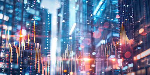 © britaseifert, Fototapeta premium Abstract stock market graph and financial chart on city background with blurry skyscrapers, business concept of financial data