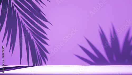 © Om-gnit, Naklejka premium Abstract studio purple background for product presentation. Empty room with shadows of window and flowers and palm leaves . 3d room with copy space. Summer concert. backdrop. beauty product placement.