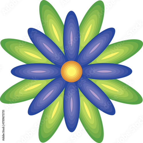© keegan, Naklejka premium Abstract stylized flower with blue petals and green leaves against a white background with yellow center detail