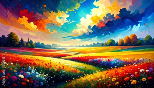 © Stefan Schurr, Fototapeta premium abstract summer illustration with a field of flowers and the sky, dramatic landscape
