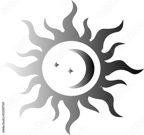 © vectorfusionart, Naklejka premium Abstract sun-moon vector is radiating metallic rays with moon and stars on transparent background