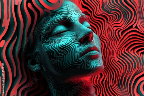 Naklejka premium Abstract Surreal Portrait with Vibrant Red and Teal Swirling Patterns