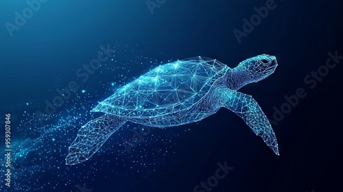 © Palung, Fototapeta premium Abstract swimming sea turtle in polygons on technology blue background. Low poly wire frame marine life concept. Polygonal 3D vector illustration.