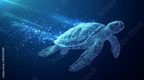 © Palung, Obraz premium Abstract swimming sea turtle in polygons on technology blue background. Low poly wire frame marine life concept. Polygonal 3D vector illustration.
