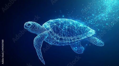 © Palung, Obraz premium Abstract swimming sea turtle in polygons on technology blue background. Low poly wire frame marine life concept. Polygonal 3D vector illustration.