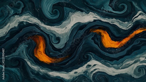 Fototapeta premium Abstract Swirling Ocean Waves Painting, Deep Blue and Orange Hues