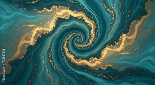 Fototapeta premium Abstract Swirling Teal and Gold Fluid Art Texture Ephemeral Cosmic Galaxy Vortex