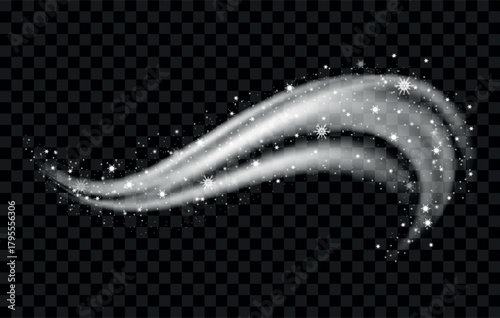 Naklejka premium Abstract swirling white smoke trail with sparkling glitter particles on dark...