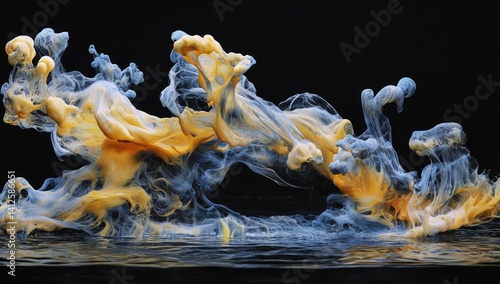 Fototapeta premium Abstract swirling yellow and blue ink in water against a black background