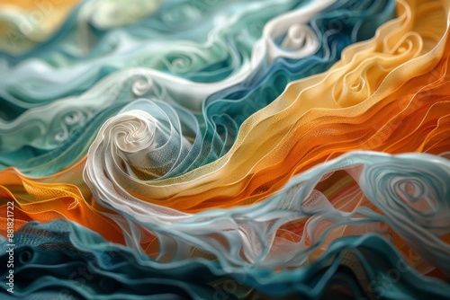 © racesy, Obraz premium Abstract Swirls of Orange, Blue and White Fabric