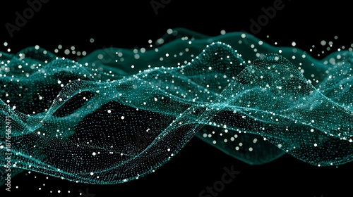 Fototapeta premium Abstract teal digital wave with particles and flowing mesh in a dark background