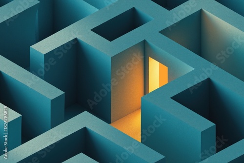 Fototapeta premium Abstract teal maze with golden-lit exit corridor, minimal isometric concept...