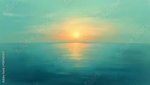 © Barek, Fototapeta premium Abstract Teal Sunrise Ocean, Calm Water, Gradient Sky, Peaceful Seascape Painting