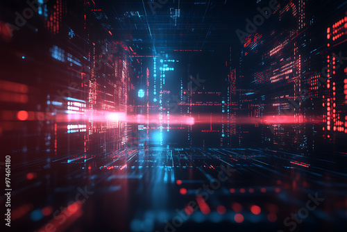 © Lora_ecology, Obraz premium Abstract tech dark background featuring flowing binary code and neon elements, creating a futuristic digital atmosphere.