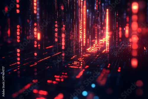 © Lora_ecology, Obraz premium Abstract tech dark background featuring flowing binary code and neon elements, creating a futuristic digital atmosphere.