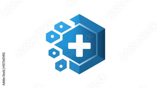 Obraz premium Abstract, tech-infused medical logo, hexagonal shape with plus sign