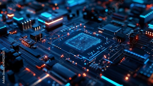 © Honey, Fototapeta premium Abstract technology background digital circuit board glowing blue and orange chip data light cyber