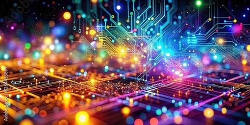 © Manatsavee, Fototapeta premium Abstract Technology Background: Glowing Particles and Circuits