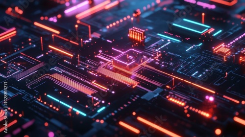 © fetmala, Fototapeta premium Abstract technology background with glowing neon circuit board. Concept of digital technology, data processing, and artificial intelligence.