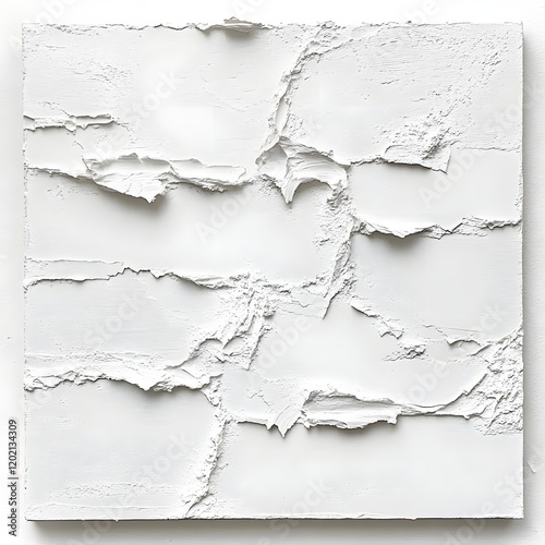 © PegawaiNegriStock, Obraz premium Abstract textured white surface with cracks and layers, emphasizing materiality and form.