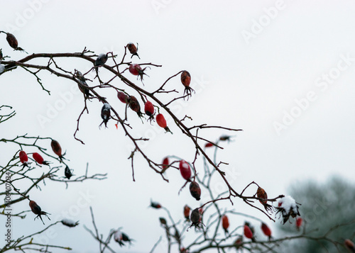 Fototapeta premium abstract tree branch patterns, snowy tree branches with red berries,...