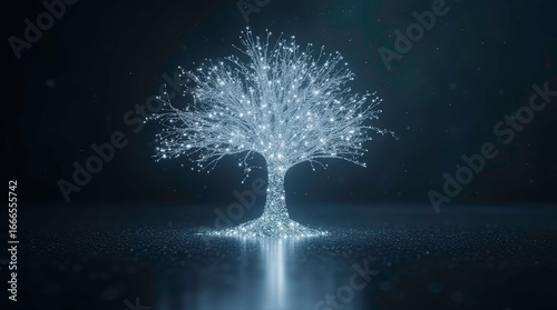 © AI, Obraz premium Abstract tree made of light and data glowing white and silver particles branching out and reflecting with earth